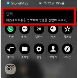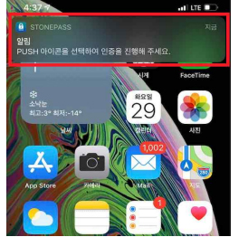 2) 스마트 인증 ID/PW 로그인 후 “스톤패스 로그인”을 클릭하면 스마트폰으로 알림(푸시)가 발송되고 알림 클릭 후 2차 인증을 진행합니다.